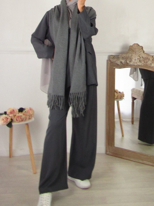 Apportez une touche élégante et moderne à votre garde-robe avec ce tailleur gris. Composé d’une veste sans épaulettes à deux boutons et d’un pantalon coupe large élastiqué à la taille, il allie confort et raffinement. Parfait pour un look chic décontracté ou même habillé selon l’occasion .